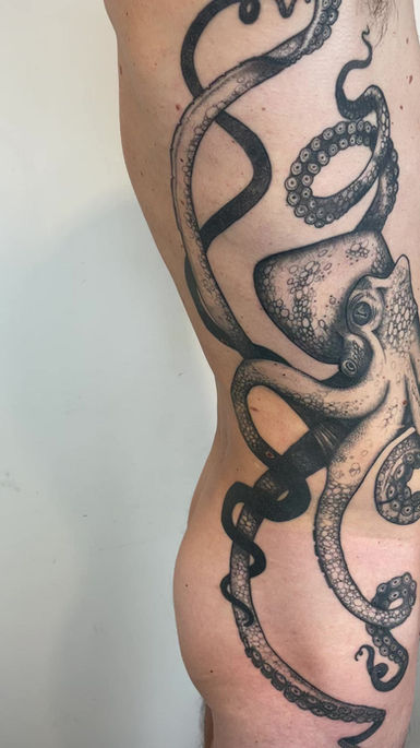 Après une première esquisse sur sa peau directement afin de lui construire le meilleur placement, j'ai dessiné la pieuvre dans son ensemble. S'en sont suivi quelques séances de tattoo qui ont fait naître, ventouse par ventouse, ce céphalopode qui aujourd'hui respire avec son porteur.